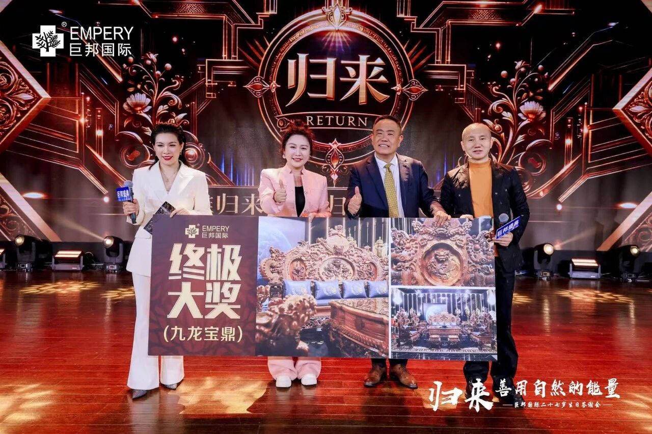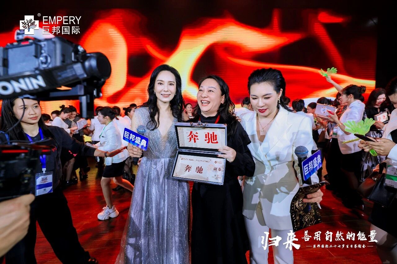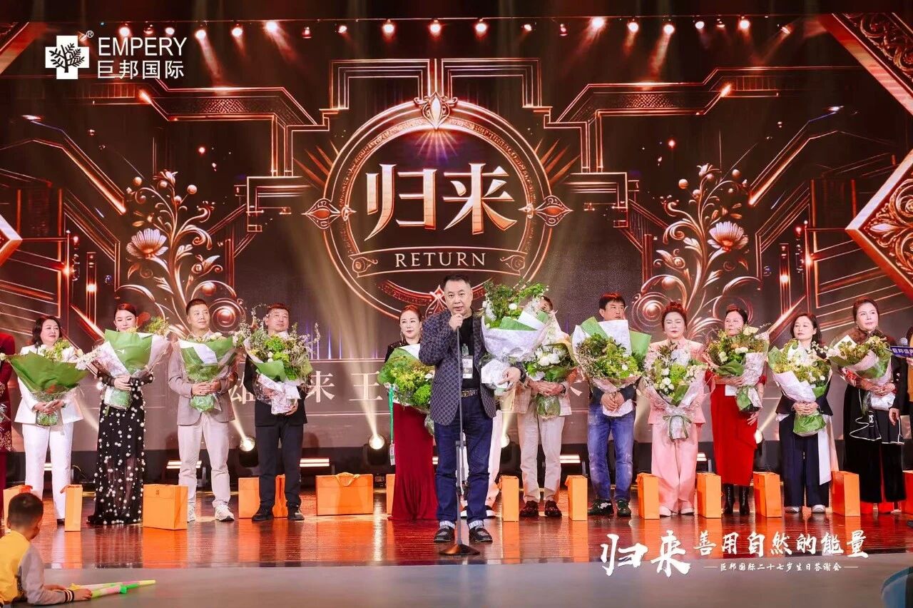 主持人四哥罗小林开场:“2011年,巨邦基地落成,12岁巨邦年会就在这里举行!十五年过去了,今天来到巨邦基地生态园,我们走了整整三个小时,已经没有语言来表白此刻、此情、此景。归来,十五个商标、十五面旗帜、十五个产业链在一步步实现,巨邦在制定标准,巨邦在定义未来,展现全新的美业格局!”