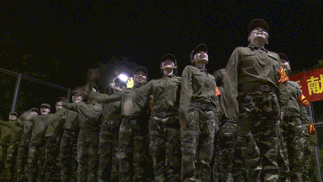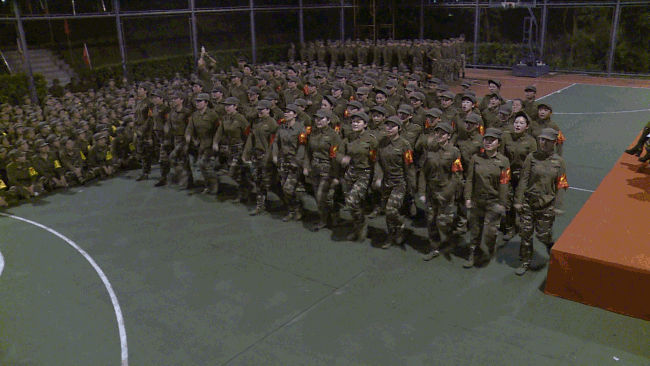 但当镜头略过,停住,却发现家人们还能露出笑容。与之对应的是,额头上的头发早已汗湿,粘在了皮肤上,没有风吹过,也不能用手去挑开一下。因为此时的手,正忙碌于执行教官的指令。边上更有一千多只眼睛正抖擞着精神看着呢。